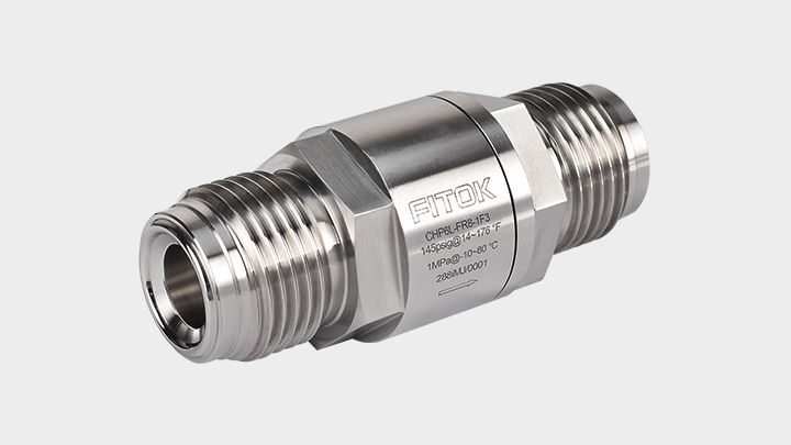 CHP 系列低压中流量单向阀开启压力小0.02 bar (1/3 psig),灵敏度高;最大工作压力为 10 bar (145 psig);流量系数 2.5;阀体与垫片之间为金属硬密封,确保密封性能;密封圈与阀体之间呈锥面密封,具有出色的反向密封性能,多种端口类型可选。