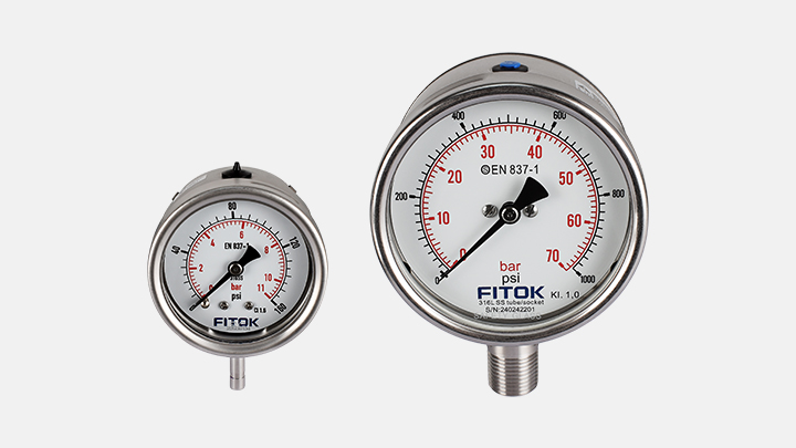 GB 系列安全不锈钢压力表是一种带有安全隔爆层的坚固型压力表,具有更高安全要求,适用于测量不粘滞、不结晶、有腐蚀性的气体或液体介质压力。可选充油型,适用于动态压力和震动场合,有助于吸收振动和压力峰值,同时延长压力表的使用寿命。有下端安装或下端向后安装方式可选,备有 63 mm 和 100 mm 尺寸的表盘,最高量程可达 15,000 psi,最大介质温度范围 -40℃ 至 200℃(-40℉ 至 392℉),可选择真空压力表用于真空应用。