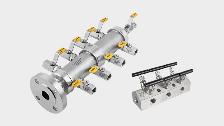 气源分配器或者分流阀组,都是一种气源分配辅助装置,把单路气源分配给多路使用。气源分配器(蓝狮在线AH系列)是由管子制成,分流阀组(蓝狮在线CM系列)是由棒材加工而成。气源分配器一般是用螺纹或者法兰的方式和供气箱连接,由一条管路送至气源分配器,再分配供气至各单台仪表。其主要优点为安装方便、操作简单、便于仪表维修、节省成本,广泛应用于如化工、医药、电力以及纺织等行业。分流阀组采用紧凑型设计,具有背密封功能,广泛用于石化行业中。